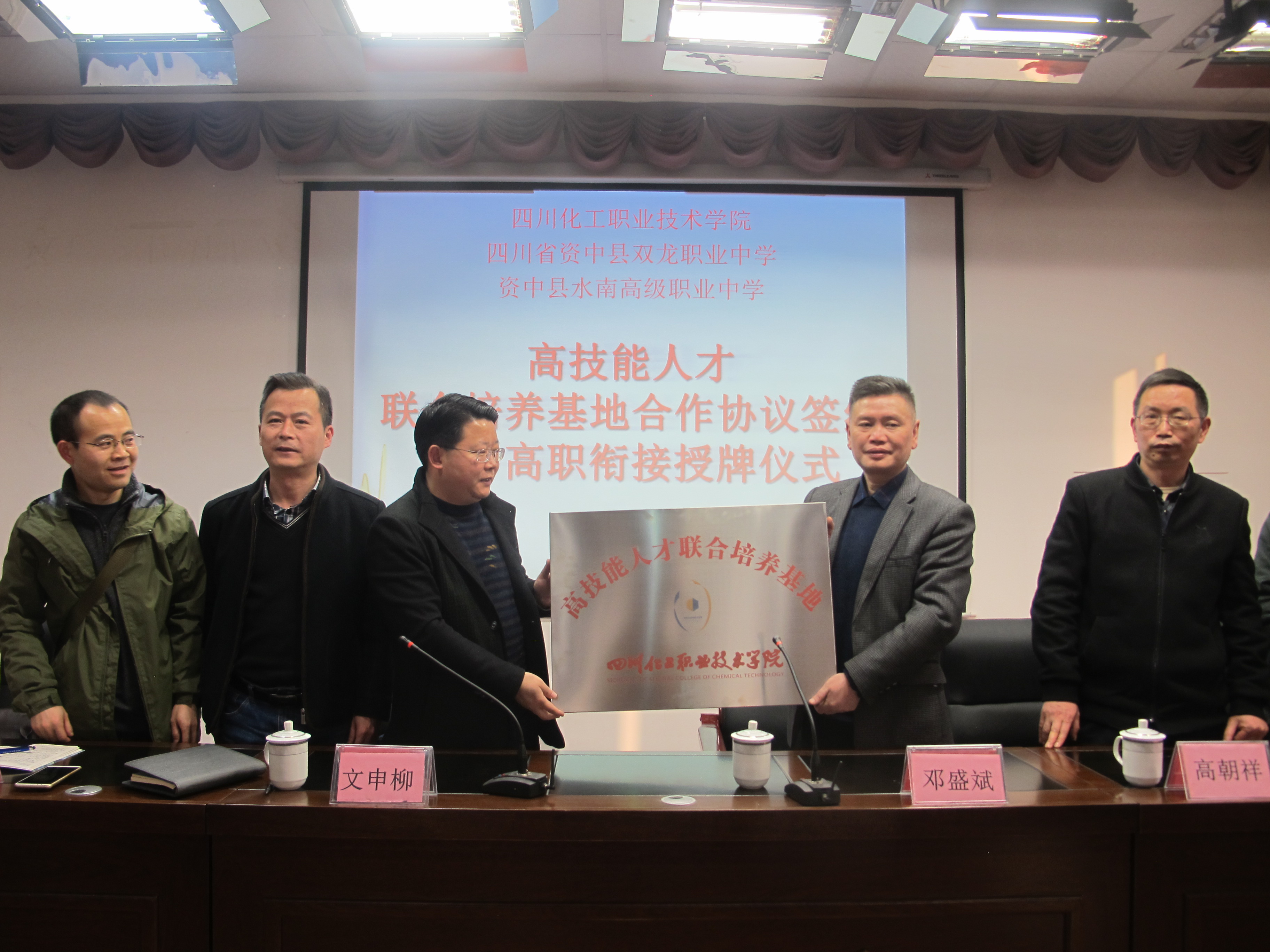 随后,在200余名师生见证下,四川化院文院长和邓校长共同签署了四川化院——资中县职业技术学校《高技能人才联合培养基地》协议书;签约仪式后文院长将“高技能人才联合培养基地”牌匾授予双龙职中邓盛斌校长。