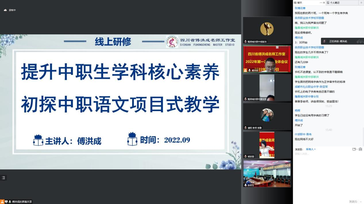 四川省傅洪成名师工作室第一次全体会议由工作室领衔人傅洪成老师主持,工作室全体成员、青年成员(学员)、部分成员所在学校语文学科教师共计120余人线上参会。