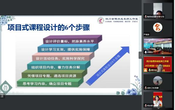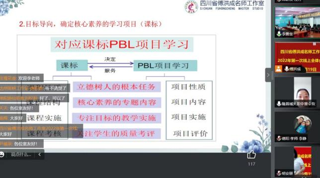 本次线上会议分四个内容二项议程。首先由四川省傅洪成名师工作室课题组组长、四川省剑阁职业中学高级讲师、四川省特级教师李勇生老师对工作室课题研究工作作说明、提要求,并以《基于核心素养培养的中职语文项目式学习及设计探析》为题进行专题讲座。李勇生老师的专题讲座从项目式PBL、项目式和核心素养、中职语文项目式学习设计、推进项目式的思考四个方面展开具体论述。讲座内容丰富、重点突出,紧密结合中职语文项目式教学实际,既有深入浅出的理论阐述,又有形式多样的项目式学习设计,更有实践层面的推进思考。