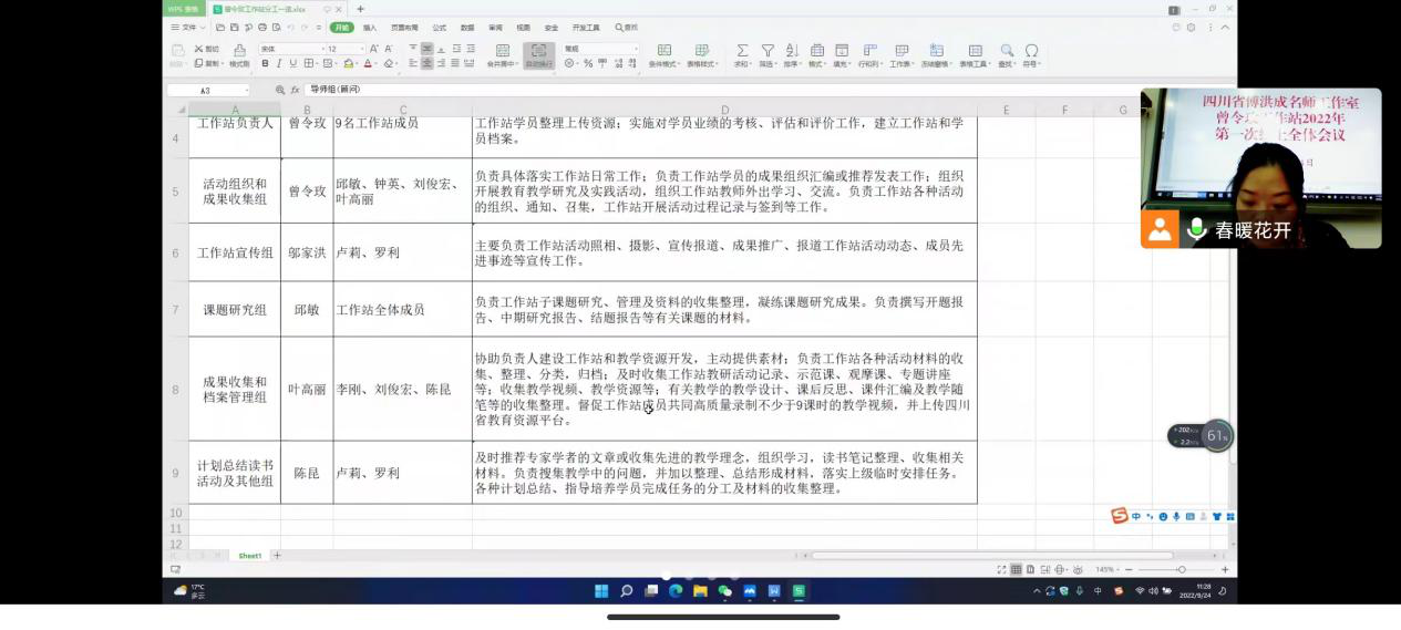 会议由工作站站长曾令玫老师主持。她首先传达了四川省傅洪成名师工作室2022年第一次线上全体会议的精神,“云端”介绍了工作站的9名成员。会上,曾令玫老师解读了《四川省傅洪成名师工作室曾令玫工作站三年建设规划方案》(下称“方案”),布置了工作室近期任务。