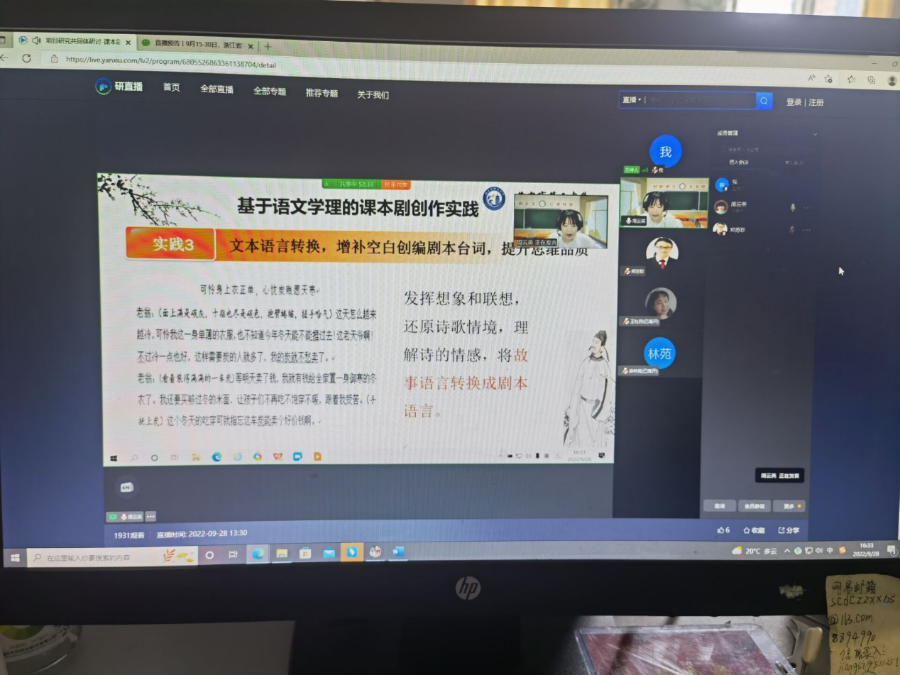 项目式教学是体现素养导向的教学实践,是一个积极而稳妥的改革方向。它既是对学科实践的重视,又是对综合性学习的强化,是学科课堂教学改革的方向。2022年9月28日,傅洪成名师工作室隆红梅站参加了以“项目研究共同体研讨-课本剧(初中语文)”为主题的“项目式教学”线上研讨会。