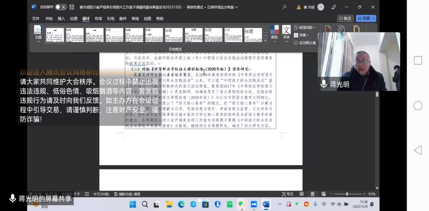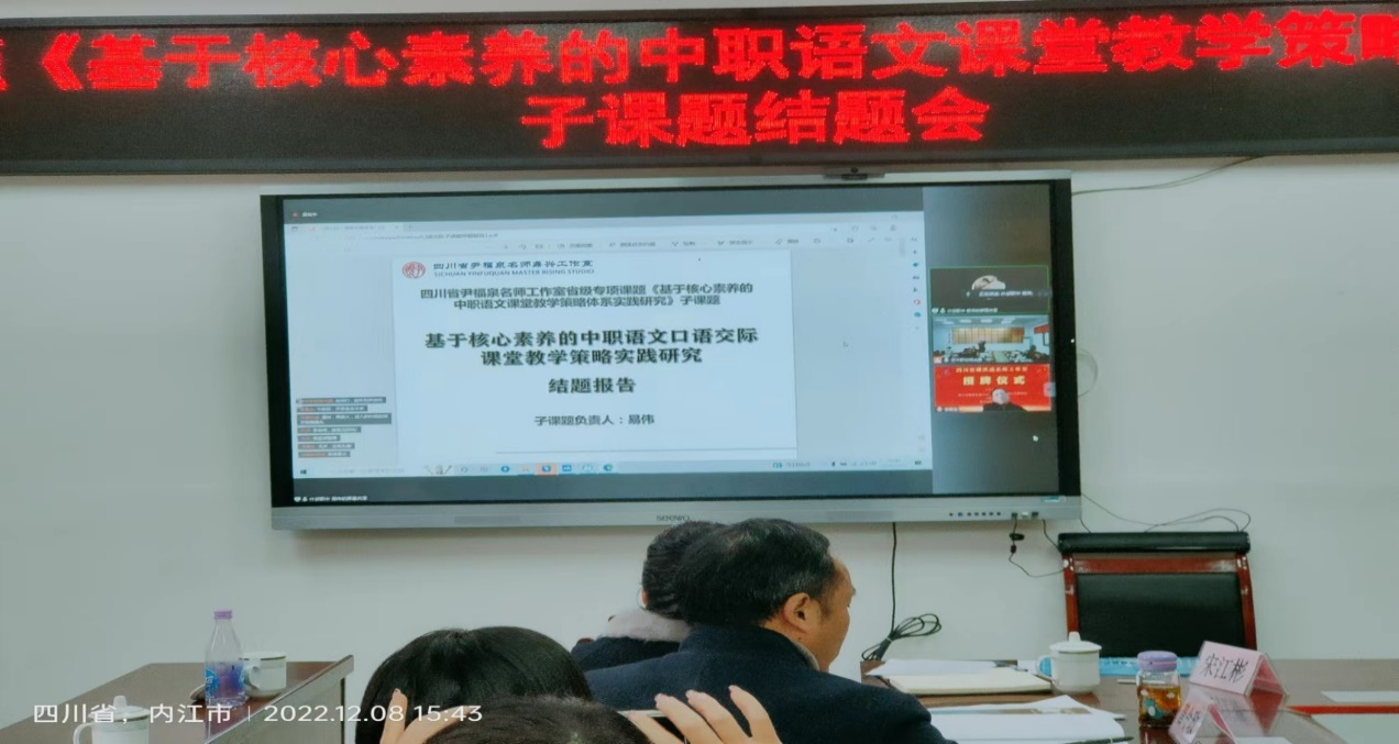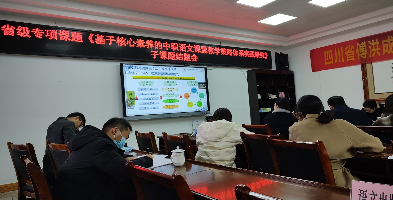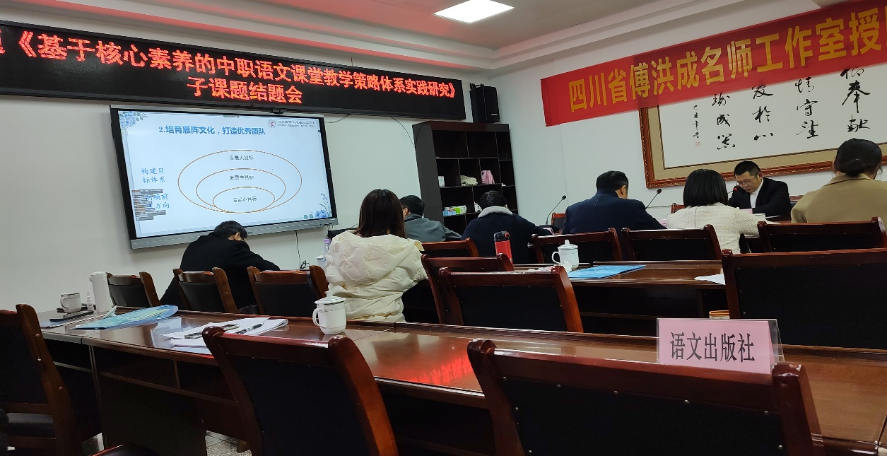 集中研修学习环节中,活动还于12月9日开展了省级课题《基于核心素养的中职语文课堂教学策略体系实践研究》子课题结题会。活动由工作室导师尹福泉名师主持。四川省尹福泉名师工作室,也是四川省傅洪成名师工作室教师易伟、邓丽霞、王伦万、傅洪成、蒋光明等5人汇报了子课题工作。5位教师通过展示、汇报“课题提出、研究意义、研究目标、研究措施、研究活动”等工作形成了《基于核心素养的中职语文口语交际课堂教学策略实践研究》研究报告、《基于语文核心素养的中职现代文阅读教学中实施美育的实践研究》研究报告、《基于核心素养培养的中职语文古诗文阅读教学改革实践研究》研究报告、《中职语文微写作课堂教学策略实践研究》研究报告、《中职语文综合性实践活动课程开发深化探索》研究报告等成果。课题组专家、四川省特级教师李勇生对子课题工作报告作了详细点评,并建议工作室准予5个子课题结题。