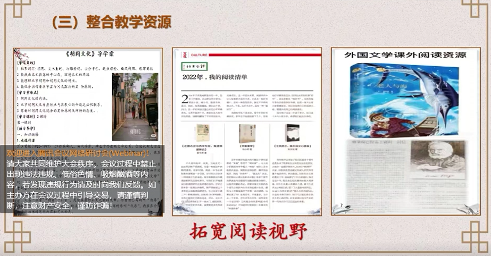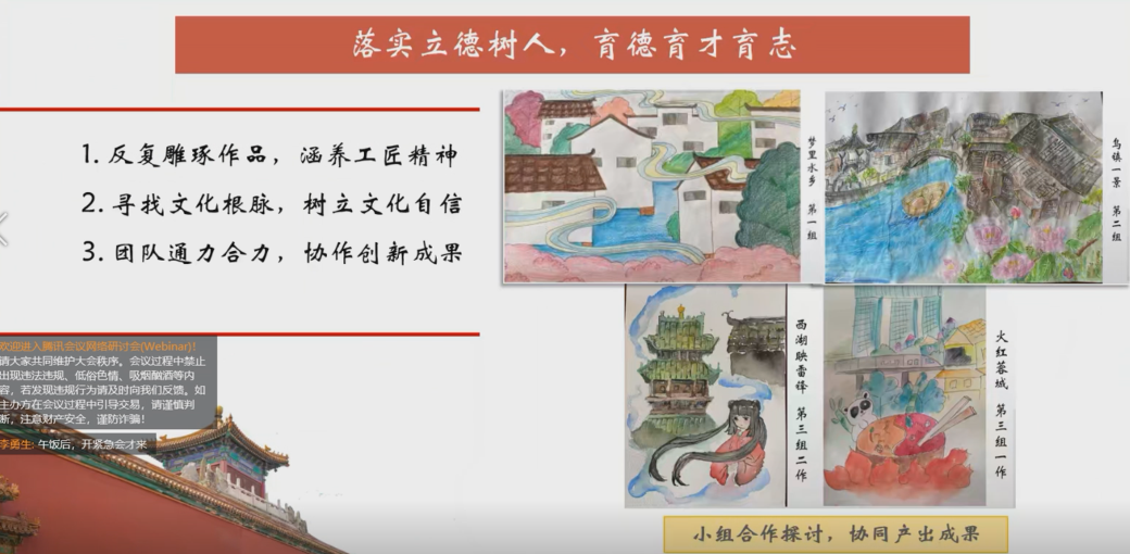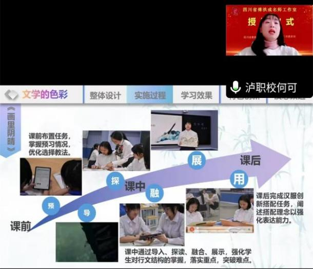 泸州市职业技术学校何可老师给工作室展示的作品是《文学的色彩》,该作品获四川省2022年中职教师教学能力比赛一等奖。何可老师用精美的PPT、精当的语言,从教学设计、实施过程、学习效果、特色创新、教学反思、教学策略等方面为我们展示了教学实施情况。分享内容高度凝练、简明生动,为全体参会教师提供了一个开阔视野、激活思维、观摩学习的机会。
