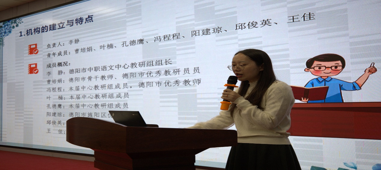 德阳市中职语文中心教研组组长、四川省孝泉师范学校李静站长以“凝心聚力促成长,携手共进绽芳华”为主题,从工作站的建设、研修活动、成果汇报、反思与工作思路四个方面进行工作站的汇报阐述,精彩纷呈。