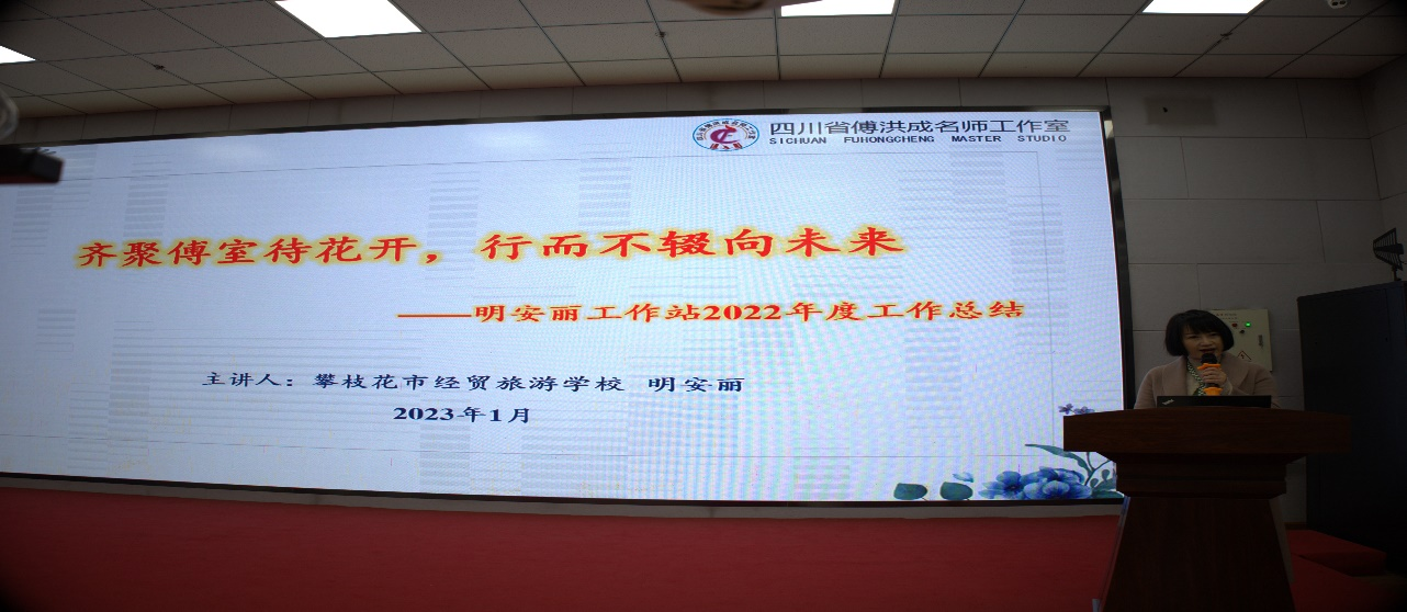 攀枝花市经贸旅游学校的明安丽站长以“齐聚傅室待花开,行而不辍向未来”为主题,从“制定计划,规范管理”、“理论学习,积淀提升”、“研修学习,搭建平台”、“教学研讨,促进成长”、“勤勉工作,成果丰硕”、“查漏补缺,规划未来”六个方面进行了工作站2022年度工作总结。
