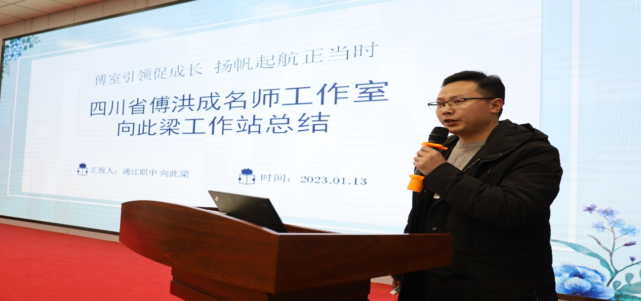 通江县职业高级中学向此梁站长以“傅室引领促成长,扬帆起航正当时”为主题,从工作站建设、开展的工作、工作展望三个方面汇报总结了该工作站半年来“有序有效,共生共长”的收获与成长。