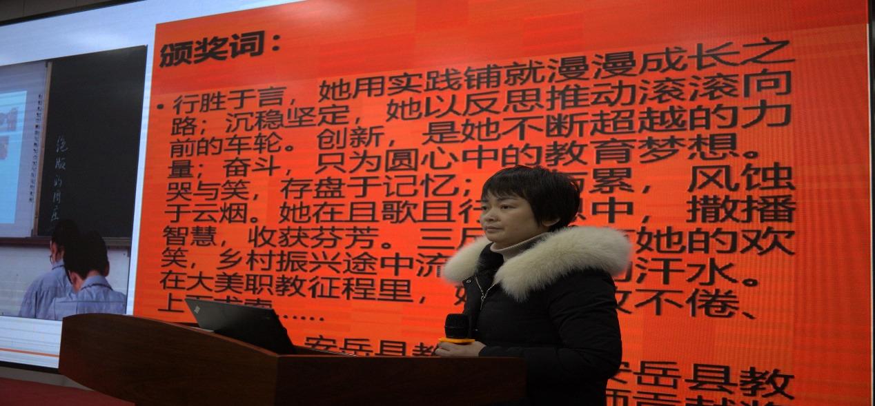 四川省安岳第一职业技术学校陈晓英站长以“英慰有你,缤纷四季”为主题,从“仲夏相遇”、“秋日携扶”、“隆冬回望”、“新 春共期”四个方面进行汇报阐述,她表示工作室将赓续初心,笃行不怠,行稳致远!