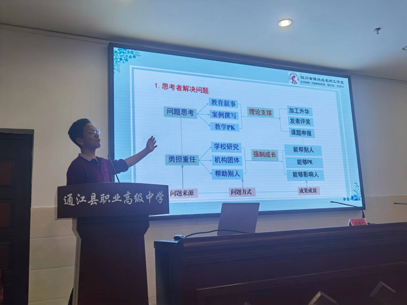 在专题讲座上,广元剑阁职中李勇生老师作《教师做科研——走向 成长之路》专题讲座。李老师从自身的科研之路出发,用幽默风趣的语言讲述了教育科研的驱动力、研究阶段技巧、研究程式和对教师科研的思考。李老师的讲座给当场的老师们极大的启发。