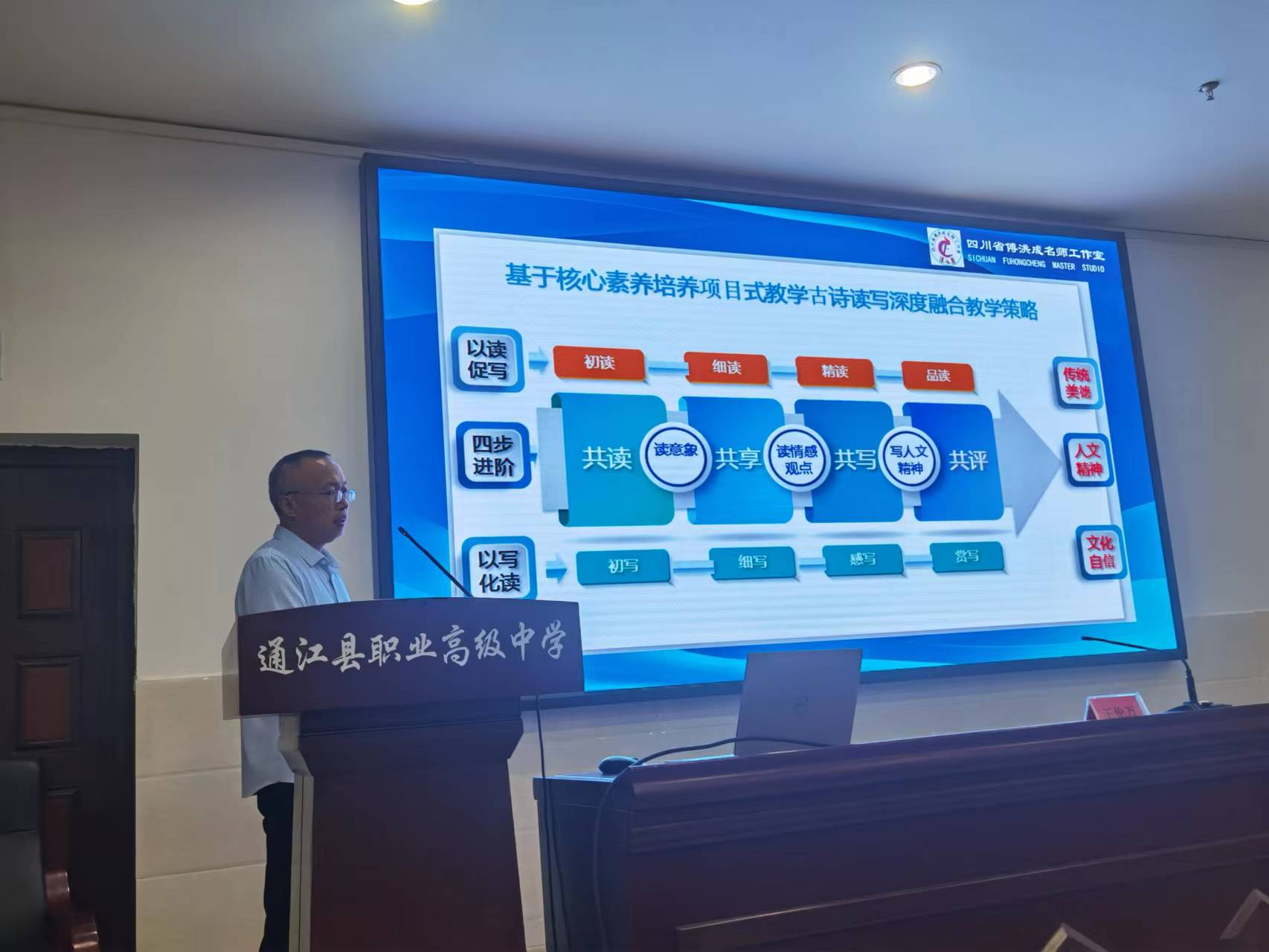 中江县职业中专学校的王伦万老师作专题讲座《基于核心素养视域的项目式教学读写深度融合——以赏析古诗〈圣泉晏〉为例》。王老师用质朴的语言,从语文核心素养出发,谈到中职语文项目式教学,再到古诗项目教学读写深度融合,最后到古诗项目教学读写深度融合案例,层层深入,内容极其丰富。