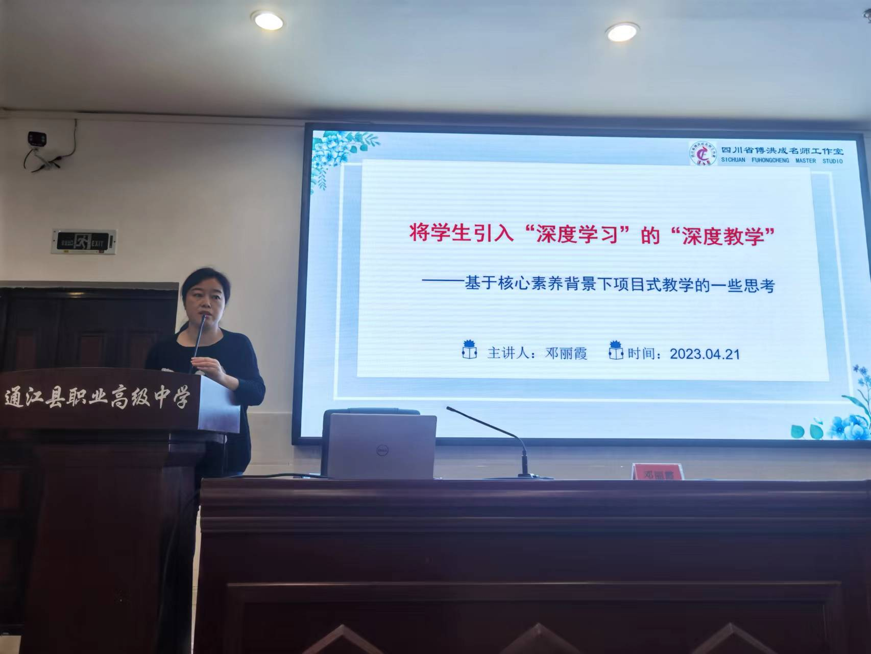 自贡职业技术学校邓丽霞老师作《将学生引入“深度学习”的“深度教学”——基于核心素养背景下项目式教学的一些思考》专题讲座。邓老师分享了对“深度教学”理解,并提出要遵循“五个注重”:注重价值引领,注重问题导向,注重思维培养,注重学科整合, 注重自主探究。