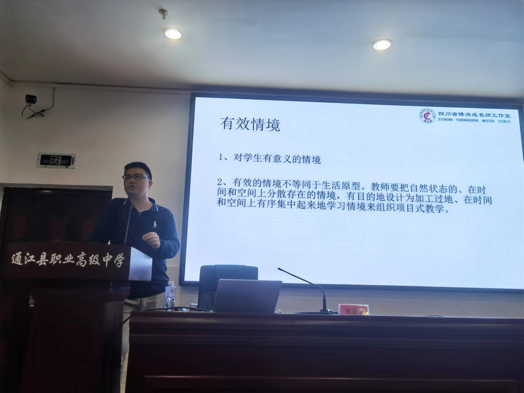 成都市礼仪职业中学陈亚军老师作《项目式教学三大关键词:情境、探究、构建》专题讲座。陈老师从情境、探究、建构三个维度深入探讨了项目式教学模式,让在场的老师看到一位青年教师的锐气。