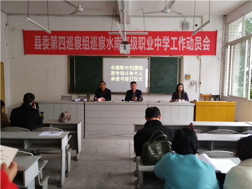 为了深入贯彻落实十九大部署和习总书记重要指示精神,切实扫除黑恶势力,增强师生安全感,保持教育大局稳定。根据资中县教育局《资中县教育系统扫黑除恶专项斗争工作方案》精神,进一步推进扫黑除恶工作的开展资中县职业技术学校于2018年11月6日召开了资中县职业技术学校扫黑除恶专项斗争再动员再部署工作推进会暨“扫黑除恶专项斗争个人承诺书签订仪式”。