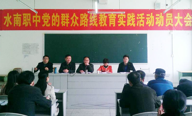 2014年3月24日由我校领导及县教育局领导组织全体水南职中教师参与党的群众路线教育实践活动动员大会。在大会上,吴书记认真讲解我校党的群众路线教育实践活动方案,其中包括四点:(一)统一思想,领会精神;(二)把握重点,明确目标;(三)抓好载体,落实环节;(四)加强领导,精心组织。我校全体教师认真学习党的群众路线教育实践活动方案。之后,由教育局刘主任从三个方面讲解:(一)认真领会上级精神、认真落实;(二)认真开展教育实践活动;(三)务实管理措施,重视督导工作。