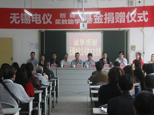 4月24日,江苏无锡电仪有限公司向水南职中、双龙职中创新奖教助学基金捐赠仪式在水南职中隆重举行。无锡电仪有限公司董事长张健、水南职中全体教职工、双龙职中部分领导参加了捐赠仪式;资中县副县长肖和平、县教育基金会理事长叶其良等受邀出席了捐赠仪式。