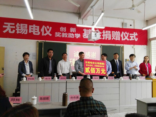 仪式上,无锡电仪有限公司向水南职中、双龙职中捐赠了200万元创新奖教助学基金。双龙职中兼水南职中校长邓盛斌代表受捐赠学校发言。他表示,十分感谢无锡电仪有限公司的爱心捐赠,以及近年来在职教发展艰难的情况下,为两校的工学结合、捐资助学、改善设备及校园环境做出的大力支持,水职、双职在办学规模上已逐渐走出低谷,有了较好的发展,将争取更大的进步来回报企业的厚爱。江苏无锡电仪有限公司董事长张健在讲话中指出,无锡电仪有限公司与水职、双职多年的校企合作可谓是成功的典范。并强调“青年强,则国强;教育强,则国强。”江苏无锡电仪有限公司将加大对水职、双职的帮助力度,深化校企合作,在谋求企业转型的同时也尽可能的回馈社会。随后,县教育局基金会理事长叶其良发言,表示此基金将主要用于两校智慧教室的建设。最后,肖和平副县长代表资中县政府对企业的义举表示感谢,并希望能进一步加深交流、增进感情、由校企合作深化到县企合作。